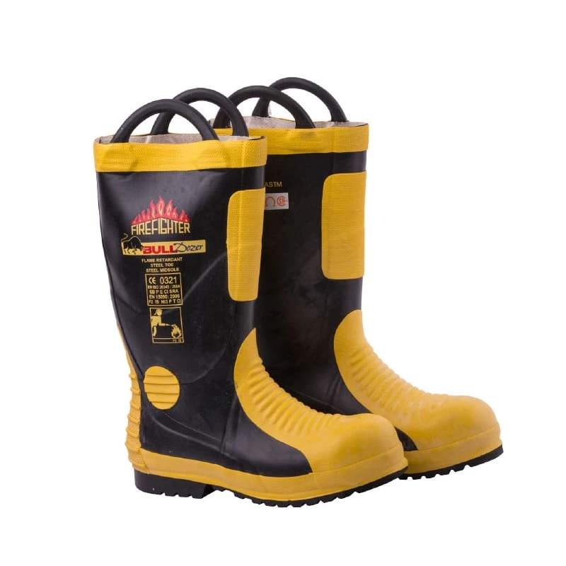 Bulldozer BD 9788 Firefighter Boots Manufactured using both 65% Natural Rubber30% Styrene Materials. Butadiene Rubber and 5% Chloroprene Rubber, 80% Chloroprene Rubber and 20% Nitrile Rubber Oil Resistant Sole.