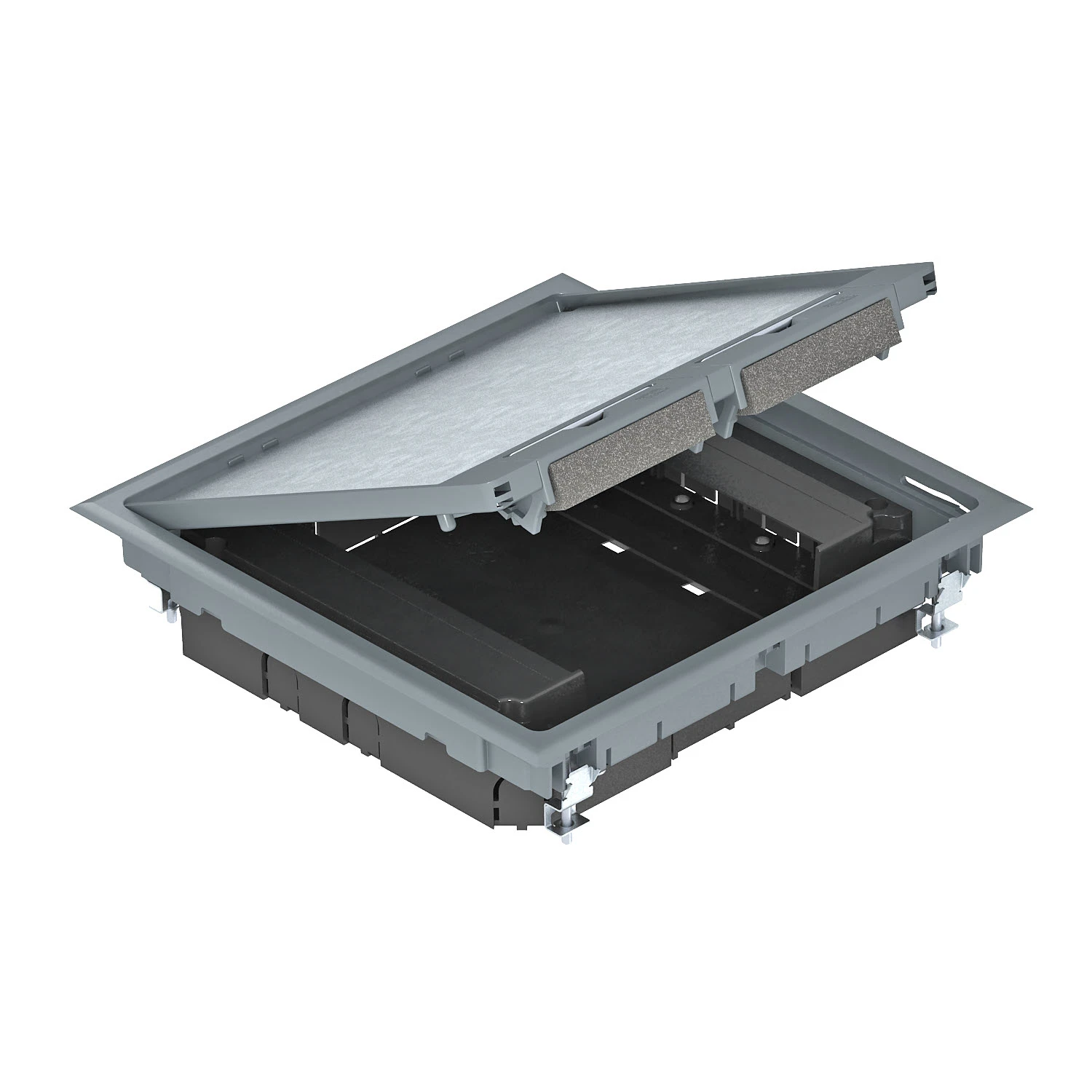 Square screed socket with GES9 UGE service unit for use in screed floors. With pre-marked