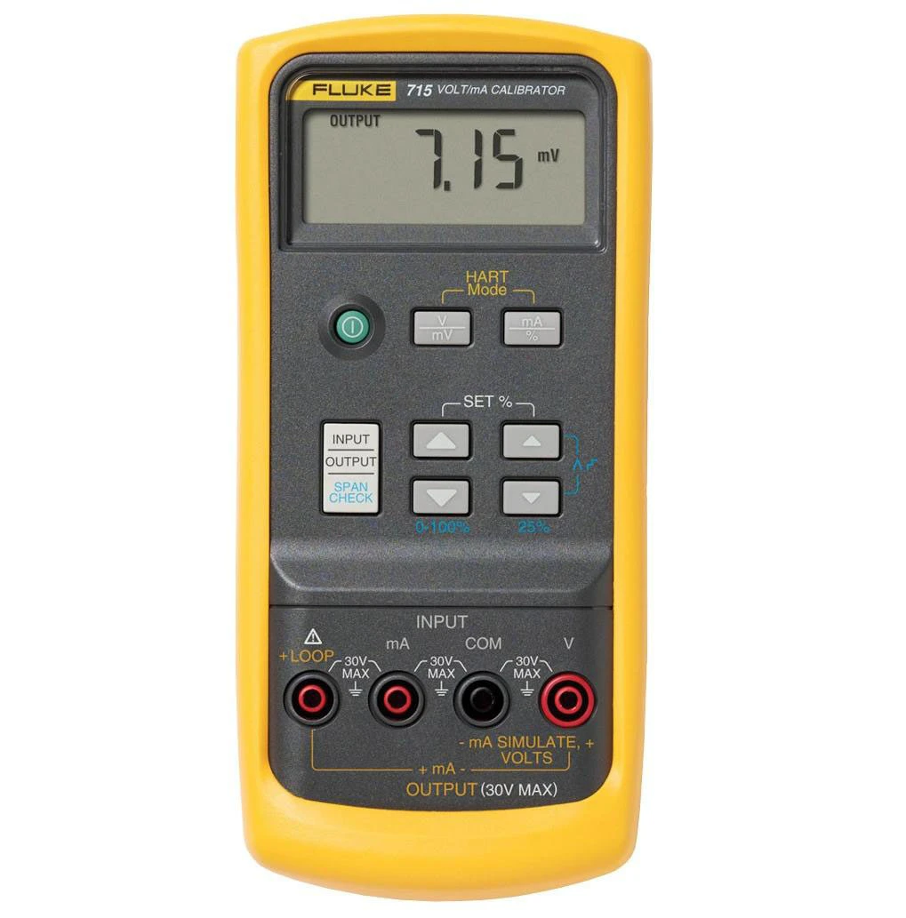 The Fluke 715 Volt mA Calibrator delivers outstanding performance, durability, and reliability in a compact, lightweight tool. Offered in the rugged Fluke 80 Series DMM package, the calibrator measures loop current as well as voltage output. It sources voltage to 200 mV or 20 V, measures loop current (0-20 mA, 4-20 mA) signals with 0 .01 % accuracy and 1 µA resolution, and measures voltage output process signals from PLCs and transmitters. It can source or simulate 4-20 mA loop current and provides a 24 V loop supply with simultaneous current measurement. The 715 is also extremely easy to use with a simple push button interface similar to the multifunction Fluke 750 Series Documenting Process Calibrators. It features the rugged construction that Fluke tools are known for and is EMI tolerant and dust and splash resistant. It also features a removable battery door for quick battery changes.