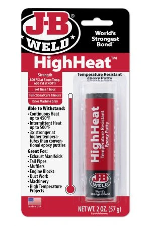HighHeat™ is a hand mixable epoxy putty stick specifically formulated to bond and repair materials that will be exposed to high temperatures in automotive and industrial maintenance applications. It cures to a tough, hard bond with little to no shrinkage. This industrial-strength product outperforms conventional epoxy putties at high temperatures and sets in 1 hour at room temperature. After 8 hours, it can be drilled, tapped, machined, ground, filed and painted. HighHeat™ is rated at a tensile strength of 4000 PSI and cures to a machine grey in color. It is able to withstand continuous heat exposure of 450ºF and intermittent heat exposure to 500ºF