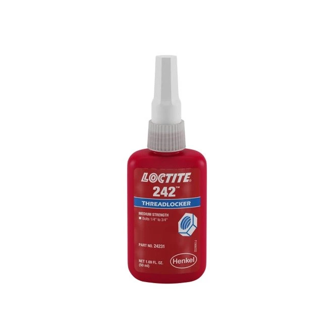LOCTITE® 242 is a medium strength, medium viscosity, methacrylate-based threadlocking adhesive offering general purpose qualities. The product provides quick fixture times on steel, brass and stainless steel of 5, 15 and 20 min respectively. LOCTITE 242 is thixotropic to prevent migration after application and is intended for fasteners that require normal disassembly with standard hand tools.