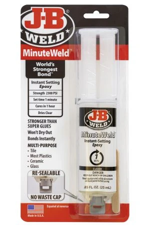 MinuteWeld™ is a special formulated, high-strength, two-part instant setting epoxy. MinuteWeld™ will set under most temperature conditions in one minute. MinuteWeld™ is designed to adhere to multiple surfaces and can be used on ceramic, tile, glass, stone, most plastics, wood and metal.